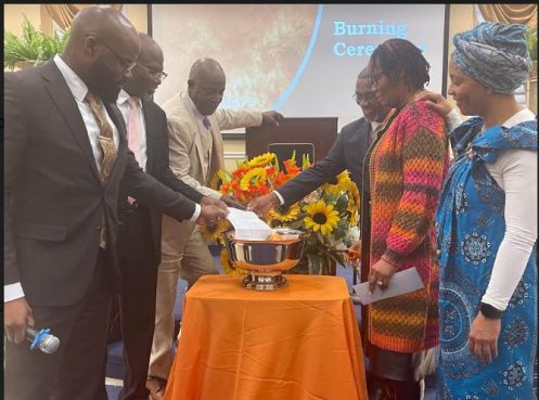 Pastor Pierre Francois, SEC Executive Secretary, joins SEC President, Dr. Michael Owusu, first Pastor (1994 - 2002) and one of the founders of Golden Gate All Nations SDA in Naples, Florida, at the Mortgage Burning Celebration on Jan 14, 2023. Next to him is Dr. Walter Douglas (GGAN Pastor from 2015 – 2019). Looking on are the Church Clerk, Sister Catherine James-Bell, Treasurer, Sister Andrea Alexander, and Dr. Trevor Gardner, Head Elder.